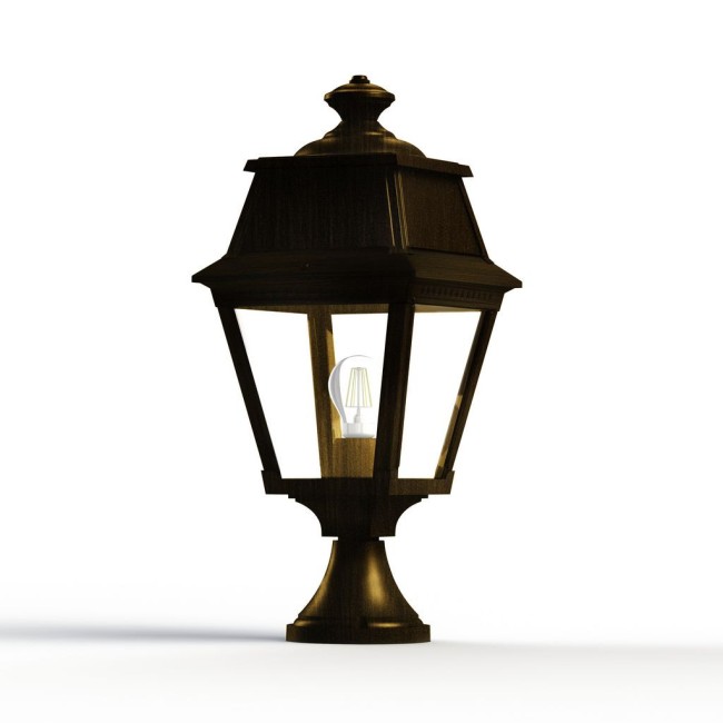 Borne AVENUE 2 en aluminium, E27, IP44, classe 1, diffuseurs verre clair. Finition Patine dorée 009. Garantie 25 ans anticorrosion sur l'aluminium