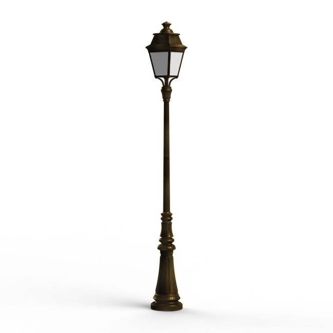Lampadaire 1 tête AVENUE 3 en aluminium, LED 35W 2700°K, IP44, classe 1, diffuseur méthacrylate opale. Finition Patine dorée 009. Garantie 25 ans anticorrosion sur l'aluminium