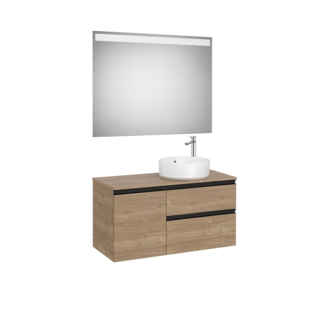 The gap pack 2 tiroirs + 1 porte pour vasque à droite 1000mm (meuble+plan+miroir) noyer/poignées noires