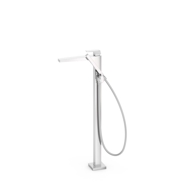 Mitigeur sur pied pour baignoire et douche Boîtier encastré (ref. 26285350) non compris. 1 colonne verticale d’alimentation en eau au sol. Support pour douchette à main avec vanne d’arrêt et régulation de débit indépendant. Douchette à main anticalcaire en laiton. Flexible satin. Finition: Chromé. Gamme: Slim