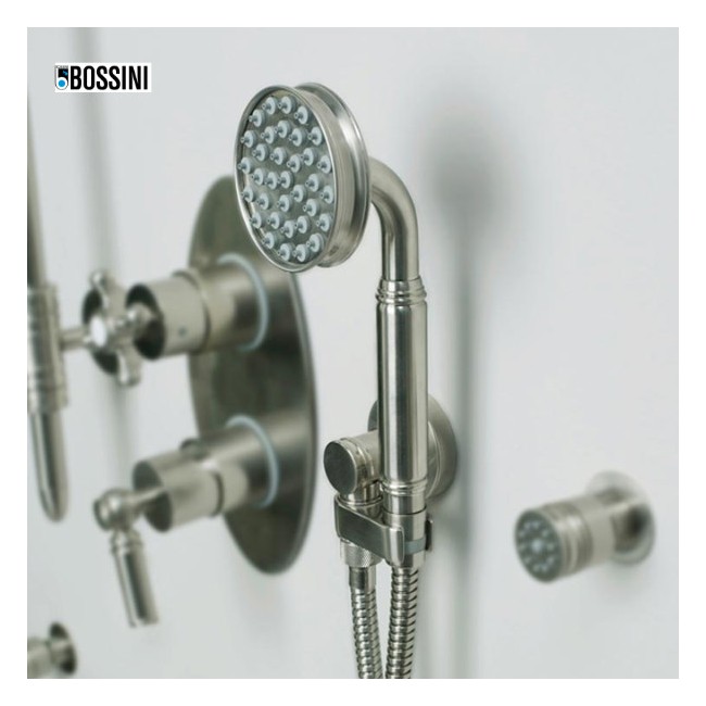 Kit de douche avec douchette Liberty, support et flexible : Tout en un pour votre confort dans la douche ! Ensemble de douche Liberty-Gom, sortie murale avec support orientable et flexible laiton double agrafage cm 150. Douchette : B00193 - Douchette Liberty-Gom Ø 81 monojet. Flexible : A03045 - Flexible laiton 125cm double agrafage 1/2” x 1/2” FF . Support de douche : C17000 - Support orientable en laiton. 1 jet : pluie . Finition : Nickel satiné . Garantie 2 ans . Bossini est une marque italienne qui sait lier tradition et modernité. Dans sa gamme Liberty Line, Bossini a intégré toute la technologie moderne dans un robinet d'aspect rétro. Liberty Line vous propose 4 finitions qui vous permettrons d'intégrer cette robinetterie dans vos intérieurs.