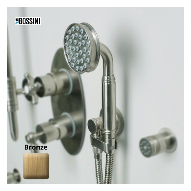 Kit de douche avec douchette Liberty, support et flexible : Tout en un pour votre confort dans la douche ! Ensemble de douche Liberty-Gom, sortie murale avec support orientable et flexible laiton double agrafage cm 150. Douchette : B00193 - Douchette Liberty-Gom Ø 81 monojet. Flexible : A03045 - Flexible laiton 125cm double agrafage 1/2” x 1/2” FF . Support de douche : C17000 - Support orientable en laiton. 1 jet : pluie . Finition : Or . Garantie 2 ans . Bossini est une marque italienne qui sait lier tradition et modernité. Dans sa gamme Liberty Line, Bossini a intégré toute la technologie moderne dans un robinet d'aspect rétro. Liberty Line vous propose 4 finitions qui vous permettrons d'intégrer cette robinetterie dans vos intérieurs.