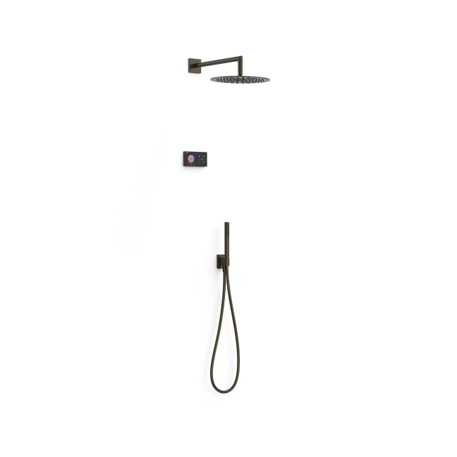 Kit robinet thermostatique électronique encastré à 2 voies Shower technology pour douche · Contrôle électronique inclus avec joints anti-humidité Schlüter. · Centrale thermostatique électronique incluse (2 voies). · Bras mural avec pommeau de douche orientable en acier inoxydable : Ø 300 mm. · Support pour douchette à main avec arrivée d’eau murale. · Douchette à main anticalcaire en laiton. · Flexible satin. Finition: Noir Bronze. Gamme: SHOWER TECHNOLOGY