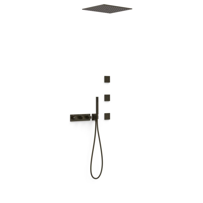 TRES Noir Bronze. Kit robinet thermostatique encastré à 4 voies B‑system pour douche · Structure thermostatique encastrée à installation horizontale incluse. · Régulateur de débit et distributeur à 4 voies. · Volant carré-rond. · Pommeau de douche encastré au plafond en acier inoxydable avec 2 types de jet (pluie/free flow). 405 x 405 mm. · 3 jets d’hydromassage encastrés. · Support pour douchette à main avec arrivée d’eau murale. · Douchette à main anticalcaire en laiton. · Flexible satin.