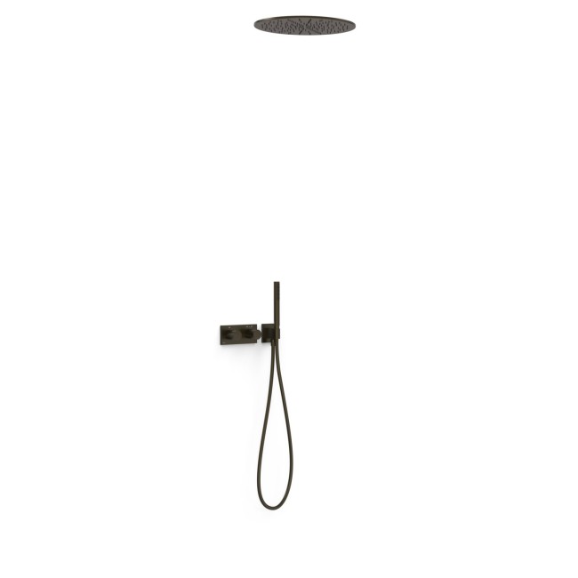 TRES Noir Bronze. Kit robinet thermostatique encastré à 2 voies B‑system pour douche · Structure thermostatique encastrée à installation horizontale incluse. · Régulateur de débit et distributeur céramique à 2 voies. · Volant rond. · Pommeau de douche encastré au plafond en acier inoxydable : Ø 405 mm. · Support pour douchette à main avec arrivée d’eau murale. · Douchette à main anticalcaire en laiton. · Flexible satin.